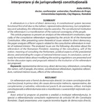 Un referendum este o formă de democraţie directă. Un sistem constituţional devine funcţional, în primul rând, din cauza democraţiei indirecte, reprezentative, dar complementar şi subsidiar, referendumul poate fi, de asemenea, utilizat. Instituţia constituţională a referendumului este o manifestare a suveranităţii naţionale a poporului. Acest articol îşi propune să prezinte o analiză a instituţiei referendumului, în special a referendumului consultativ reglementat de articolul 90 din Constituţia României. După prezentarea unor aspecte teoretice legate de democraţia directă, lucrarea analizează diferite aspecte legate de referendumul consultativ în materie de interes naţional. Problemele analizate sunt următoarele: discreţia cu privire la referendumul Preşedintelui României, sensul de consultare, voinţa naţiunii, sensul de consultare a Parlamentului, aspecte juridice ale decretului prezidenţial şi extinderea domeniilor de aplicare a problemelor de interes naţional. În concluzie, unele idei deja formulate despre modificarea reglementărilor existente sunt prezentate şi sunt propuse noi teme de discuţie şi propuneri în legătură cu instituţia referendumului.