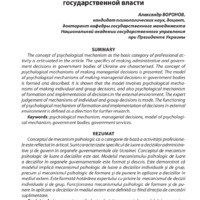 Conceptul de mecanism psihologic ca o categorie de bază a activităţii profesionale este reflectat în articol. Sunt caracterizate specificul de luare a deciziilor administrative şi de guvern în organele guvernamentale ale Ucrainei. Conceptul de mecanism psihologic de luare a deciziilor este dat. Modelul mecanismului psihologic de luare a deciziilor în organele guvernamentale este format şi descris. Este demonstrat că modelul implică mecanismul psihologic de luare a deciziilor individuale şi de grup, precum şi mecanismul psihologic de formare şi de punere în aplicare a deciziilor în mediul extern. Este formată hotărârea expertului cu privire la mecanismul de decizii individuale şi de grup. Funcţionarea mecanismului psihologic de formare şi de punere în aplicare a deciziilor în mediul extern este definită ca fiind direcţia de cercetări suplimentare.
