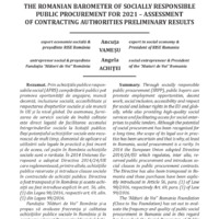 Through socially responsible public procurement (SRPP), public buyers can promote employment opportunities, decent work, social inclusion, accessibility and respect for social and labour rights in the EU and globally, while also providing high-quality social services and facilitating access for social enterprises to public tenders. Although the potential of social procurement has been recognised for a long time, the scope of its legal use in practice has been uncertain and that is why, at least in Romania, social procurement is a rarity. In 2014 the European Union adopted Directive 2014/24/EU which regulates, inter alia, reserved public procurement and introduces social clauses in public procurement contracts. The Directive has also been transposed in Romania and these purchases have been explicitly introduced in Article 56, para. (1) of Law 98/2016, respectively Art. 69, para. (1) of Law 99/2016. The “Alături de Voi” Romania Foundation (Close to You Foundation) has set out to evaluate the frequency and quality of public social procurement in Romania and in this regard has launched the Social Barometer of Public Procurement – two online surveys: one addressing contracting authorities and the other social economic operators – social enterprises, work integration social enterprises, protected authorized units and NGOs. The questionnaire aimed at assessing their awareness and the degree of knowledge of the provisions of the law on social public procurement more precisely regarding the social clauses and reserved contracts and their application in practice. The Social Barometer of public procurement used the European Commission online survey platform and the survey was open between August 10 and September 13, 2021. The article presents the main results from contracting authorities.