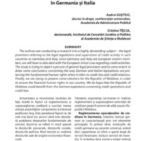 The authors are conducting a research into a highly demanding subject – the legal provisions referring to the legal regulations and supervision of credit activity in such countries as Germany and Italy. Since Germany and Italy are European Union’s members, we will have to also deal with the European Union Law regarding credit activities. The study is trying to depict a picture of general legal provisions and to some extent to draw some conclusions concerning the way German and Italian legislations are protecting the fundamental human rights when it refers to credit law and credit relations. Finally, we are trying to present some solutions for the Republic of Moldova, in order to ensure the financial human rights in our country. We do hope that the Republic of Moldova could benefit from the German experience concerning credit operations and credit law.