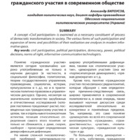 A concept «Civil participation» is examined as a necessary constituent of process of democratic transformations in society. The various forms of such participation and expansion of terms and possibilities of their realization are analyses in modern informative space.