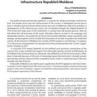 The public-private partnership represents a solution for attracting foreign investments from the private sector into the infrastructure of the country. A developed country has to have a modern and functional infrastructure and one of Moldova’s long term priorities is development of the infrastructure, which can be realized through the implementation of PPPs where the major part of the investment is coming from the private partner. Here we talk about the infrastructure of the roads, railroads, airports, as well as the sewerage and wastewater systems, the protection of the environmental-collection, waste acquisition and storage, social programs which include the renovation of schools, hospitals and residential centers. At the moment in Moldova the number of P.P.P. projects is not that big, 15 ongoing, 15 in the process of preparation for the selection of the private partner and 32 were suggested for initiation in 2011. A successful P.P.P. project depends on the political and economic conjuncture of the country, this is why it needsf the support from the public partner and the manifestation at the highest level by the private one. Moreover, the inefficiency of this kind of projects in Moldova is basically because of the lack of knowledge about the mechanism of public-private partnerships and the absence of the competitive factor which is mostly because of the lack of public partners finances. In Republic of Moldova we need to put in application the P.P.P. legislation and start implementing it at the highest level. We need more than 15 functional public-private partnership projects and a lot of trainings, support and will from the private partner, who has to import the European experience in this domain.