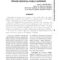 Sustuinable development of a country is nut possible unless the public administration in efficient. How efficient it is depends, mostly, tin the. human resources management in the public administration authorities, This article highlights the good practices and the issue related to the delimitation of political positions from the administrative ones, it describes the concept and international practice regarding the Senior Civil Service - the apex of the civil service hierarchy, underlines the role of senior civil servants as promoters and implementers of public administration modernization programs. The article also contains suggestions regarding the implementation of the Senior Civil Service System in the Republic of Moldova.