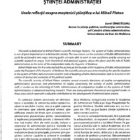 This work is dedicated to Mihail Platon's scientific heritage Platan's. The system of Public Administration is one of great importance in a democratic society. The new visions on the evolution of Public Administration could be achieved in two ways: training public servants able to work in new conditions and by carrying out scientific research to argue, from theoretical and practical aspects, about the place and the role of Public Administration in the terms of the independent state, the Republic of Moldova. Mihail Platon was the first who started this activity as the founder of the Academy of Public Administration under the President of the Republic of Moldova. His scientific concern was determined by the specific situation in the system of Public Administration and the tasks of building a Public Administration able to function in the context of democratic evolution of the political system. The scientific activity of Mihail Platon contains several research directions: a} studies conceptualizing administrative processes and phenomena; b) studies concerning the activity of public administration staff; c) studies on the reforming of Public Administration; d) comparative studies on the systems of Public Administration; e) advanced teaching research. There are many extensive theoretical and applied studies in these areas which represent a valuable contribution to the development of administrative science.