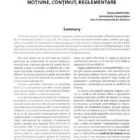 For the first time on the level of national legislation, conflict of interest has been reflected in Law on Con¬flict of Interest No.16 XVI of lb.02.2008. This study is aiminat the research of the notion, content and regu¬lation of a conflict of interest and at making proposals on the necessity of some changes in Law No. 16-XVI, regarding in particular the concept of personal interest and the extension of the list of related persons. It has been observed that the officials do not declare their interests, and the lack of Main Ethics Commission Hinders the implementation of a number of requirements of the legislative acts.
