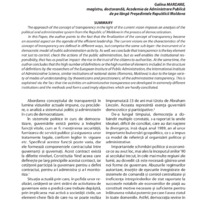 The approach of the concept of transparency in the light of the current vision imposes an analysis of the political and administrative system from the Republic of Moldova in the process of democratization. In this Paper, the author points to the fact that the finalization of the concept of transparency became an essential aspect on the agenda of the efficient leadership. The current visions on the characteristics of the concept of transparency are defined in different ways, but comprise the same sub layer: the instrument of a democratic model of public administration activity. As well, we conclude that transparence is the key element not just to control, check the actions of the public administration, but as well enables the institutional responsibility, that has as positive impact- the rise in the trust of the citizens to authorities. At the same time, the author concludes that the high number of definitions or the high number of elements included in the structure of definitions by the researchers of the European Institute of Public Administration, the International Institute of Administrative Science, similar institutions of national states (Romania, Moldova) is due to the large variety of modes of understanding (by theoreticians and practitioners) of the administrative transparency. This is explained via the fact that the activities on administrative transparence are developed in extremely different institutions and the methods and forms used imply objectives which are hardly conciliated.