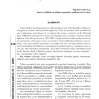In this article is a profound analysis of the banking system of the Republic of Moldova. Are given the central bank functions (officially called the national Bank of Moldova) and relationships interchange. It is indicate the primary objective of the National Bank of Moldova and namely to ensure and maintain price stability. Are given annual inflation rates during the years 1995-2008. A deep analysis is done in this article on the intsruments of monetary policy promoted by National Bank of Moldova, such as: policy rates, open market operations, overnight loan and overnight deposit used by the National Bank of Moldova as intsruments of monetary policy, compulsory reserve rate and other monetary intsruments. All of these monetary policy intsruments used by the National Bank of Moldova aimed „sterilization temporary excessive liquidity” and consequently reduce inflation.