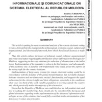 This article is putting forward a contextual analysis of the remote electronic voting systems, derived from the changes in the technological, economic, social, cultural and organizational, and theoretical framework from which this (Social Science) is made of. Thus, this article emboss the issues of technical, social, political, organizational and behavioral nature regarding the introduction of new information technologies for Moldova, suggesting in this way solutions for reduction of absenteeism at the ballot boxes. Implementation of the mandatory voting in the first instance and subsequently of the electronic one, in parallel with traditionally vote would assure the express of the voting right for the country’s citizens. Implementation of large-scale systems for remote electronic voting would be in concordance with the dynamic of the global transformations that inevitably changes both our structure and our democratic society’s functionality, and suggests the equal submission for the citizens’s rights and their obligations, especially in the conditions when over one third of the work capable population is working outside the country and which practically makes the majority of the absenteists. Given that the Republic of Moldova was established as an independent state and now is seeking EU membership, there should also be considered the European and global directions regarding to the implementation of the advanced information technologies as one of the solutions that would fully contribute to the substantiation of the democracy’s values and principles.