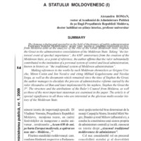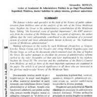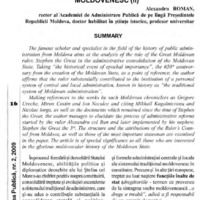 The famous scholar and specialist in the field of the history of public admin istration from Moldova aims at the analysis of the role of the Great Moldovan ruler, Stephen the Great in the administrative consolidation of the Moldovan State. Taking "the historical event of epochal importance", the 65Q' anniver sary from the creation of the Moldovan State, as a point of reference, the author affirms that the ruler substantially contributed to the institution of a personal system of central and local administration, known in history as "the traditional system of Moldovan administration". h Making references to the works by such Moldovan chroniclers as Grigore Ureche, Miron Costin and /on Neculce and citing Mikhail Kogalniceanu and Nicolae lorga, as well as the documents which remained since the time of Stephen the Great, the author manages to elucidate the process of administrative reforms started by the ruler Alexandru cel Bun and later implemented by his nephew, Stephen the Great the 3 . The structure and the attributions of the Ruler s Coun- i set from Moldova, as well as those of the most important statesman are examined : in the paper. The article is of special significance to all those who are interested in the glorious multi-secular history of the Moldovan State.