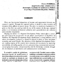 There are big internal disparities of income and opportunity between our country's regions. Through the regional policy, it should be done transfers of resources from affluent to poorer areas. The aim is to modernize backward re gions so that they can catch up with the rest of the country. In this way. regional policy is an instrument of financial solidarity and a powerful force for cohesion and economic integration. Shaping our future, is a Regional Development Policy which offers a strate gic and long-term perspective on the future development of Republic of Moldova. Tfie Regional Development Policy should have a strong influence over where development is placed or should be placed in future to have maximum economic and social benefit. The objectives of the Regional Development Policy are: making regions of the country more attractive for investments by improving accessibility, providing quality services and presennng environmental potential: encouraging innovation, entrepreneurship and the knowledge economy through the development of information and communications technologies.