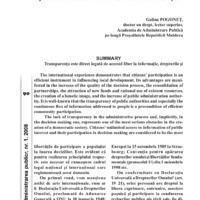 The international experience demonstrates that citizens’ participation is an efficient instrument in influencing local development. Its advantages are manifested in the increase of the quality of the decision process, the consolidation of partnerships, the attraction of new funds and rational use of existent resources, the creation of a benefic image, and the increase of public administration authority. It is well-known that the transparency of public authorities and especially the continuous flux of information addressed to people is a precondition of efficient community participation. The lack of transparency in the administrative process and, implicitly, in the decision making one, represents one of the most serious obstacles in the creation of a democratic society. Citizens’ unlimited access to information of public interest and their participation in decision making.