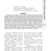 The author has the purpose in this study to demonstrate the special role of Cantemir dynasty, and firstly, that of the ruler, the state, culture and science man Dimitrie Cantemir in strengthening Moldovan statehood during that period, in establishing and developing relations of friendship and lasting alliance with Russia. This attempt is successful by scientific and historical-literary draining of the great historical novel of the famous Russian writer Z.C. Cirkova “Maria Cantemir: vizier curse” proposed to receive the Republic’s Moldova National Award for the year 2008. The author has performed a profound analysis of Peter the Great relations with Moldovan ruler, but especially with his daughter: the beautiful, erudite and full of dignity Maria Cantemir, stressing the relations for centuries of good-neighbourly and friendly relations between Moldova and Russia.