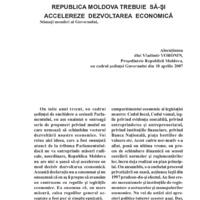 Оn iulie anul trecut, оn cadrul şedinţei de оnchidere a sesiunii Parlamentului, eu am оnaintat o оntreagă serie de propuneri privind modul оn care urmează să schimbăm vectorul dezvoltării noastre economice. Voi relua aici ideea, care a fost enunţată atunci de la tribuna Parlamentului: dacă nu va оntreprinde măsuri radicale, neordinare, Republica Moldova nu are nici o şansă să-şi accelereze оn mod decisiv dezvoltarea economică. Această declaraţie nu a оnsemnat şi nu оnseamnă că eu aş fi propus să avansăm оn contrasens cu regulile şi legităţile economice. Ea оnsemna că, оn mare măsură, calea regulilor general acceptate a fost pur şi simplu epuizată.