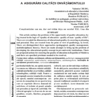 This article outlines the problem of the opportunity of quality education, being treated in the logic of “quality of education - quality of man - quality of life”. There are revealed the dimensions of educational quality, its ensuring as planning and potential. They are treated from the point of view of qualitology, by levels. There are distinguished three approaches (pedagogical, quality management, multidisciplinary theory). There are made attempts to bring up the problem of developing the educational quality concept in pre-university institutions. There are proposed actions for ensuring the quality of education in Republic of Moldova and there are specified problems needed to be resolved.