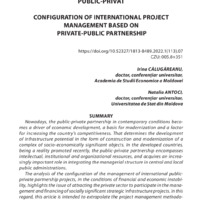 Parteneriatul public-privat în condițiile contemporane devine un driver al dezvoltării economice, o bază pentru modernizare şi un factor pentru creşterea competitivității țării, care determină dezvoltarea potențialului de infrastructură sub forma construcției şi modernizării unui complex de obiecte semnificative din punct de vedere socio-economic. Fiind o realitate promovată relativ recent în țările dezvoltate, parteneriatul public-privat înglobează resurse intelectuale, instituționale şi organizaționale şi capătă un rol din ce în ce mai important în integrarea structurii manageriale în administrațiile publice centrale şi locale. Analiza configurării managementului proiectelor internaționale de parteneriat public-privat, în condițiile instabilității financiare şi economice, evidențiază problematica atragerii sectorului privat la participarea în gestiune şi finanțare a proiectelor de infrastructură strategice semnificative din punct de vedere social. În acest sens prezentul articol este menit să extrapoleze metodologia de management a proiectelor în contextul parteneriatului public-privat, implementarea cărora poate îmbunătăți semnificativ procesul de management a proiectelor de parteneriat public-privat.