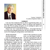 I am sure that sentiments that we all are experiencing today, are the most deepest and brightest. Today we all have just turned 15 years old. We are young, energetic; we are making new plans and are looking forward to new perspectives. When I say “we” I mean all our Moldova , our people that have set off the most difficult unforeseen, the most perspective road, the road of developing the independence and democracy.