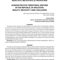 The paper’s author analyzes the administrative-territorial reform in the Republic of Moldova in terms of 3 issues addressed: existing reality, perceived necessity, and challenges to face. To achieve the said purpose, the author’s opinions have been confronted with existing legislative framework and with opinions expressed by foreign and domestic experts, as well as with lessons learned from reforms already implemented. The need for such a study has been dictated by the fact that the problems of reforms have been either approached during forums and discussion platforms, or in studies developed by foreign experts. There is, however, a need for a scientific approach. At the end of the paper challenges of an eventual reform have been listed, as identified by the paper’s author.