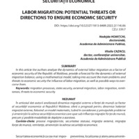 În articolul dat autorii analizeaza dinamica migrației externe a forței de munca ca factor al securitații economice a Republicii Moldova, ofera o prognoza pentru dinamica balanței migrației externe, folosind un model matematic, luând în considerare și principalele probleme și amenințari la adresa securitații economice care apar sub influența migrației forței de munca, precum și posibile modalitați de depașire a acestora.