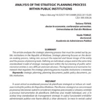 This article analyzes the strategic planning process that must be carried out by public institutions in the Republic of Moldova. Strategic planning focuses on the decisionmaking process, taking into account the expected and future image of the entity and the process of planning tools. Defining an individual, unique and at the same time standardized model of strategic management within the functioning of public administration entities is very difficult and even abstract. The legislative and normative framework that regulates the strategic planning process in public institutions is reviewed.