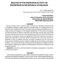Being a country with a small and open economy, the development potential of the Republic of Moldova largely depends on foreign trade, as a strategic point in the relaunch of the national economy This article aims to analyze and evaluate the innovation activity of enterprises in the Republic of Moldova. In this context, the data of the National Bureau of Statistics regarding the innovation activity were used, which served as a fundamental basis to assess the efficiency of the activity of the innovative enterprises. The analysis carried out highlighted the level of innovation of economic entities and implicitly of small and medium enterprises. Also, the actual research highlighted a series of problems faced by innovative companies, but also some reference points for different decision-makers at different decision levels, to solve these problems. The results of the study can be used in the development of different policies and strategies regarding the support and development of domestic enterprises in the innovation process.