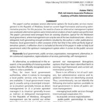 The paper’s author analyzes several alternative options for local public services management in the Republic of Moldova, based on current legal framework and existing administrative practice. For this purpose, the need to choose an alternative management option was analyzed; alternative options were listed; and an analysis of each option was performed. The paper’s perceived need emerged from an existing situation, typical for the Moldovan local government, where management can only be one of the two traditional ones - direct or delegated, both generating enough problems (studied by the author in other publications). However, local government is often unaware of the fact that it has other perfectly legal alternative options. A reflection chart is included at the end of the paper in order to help local government select the optimum management option when it comes to the public services delivery.