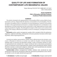 Articolul este dedicat reprezentărilor calității vieții în diferite domenii ale ştiințelor socioumane, influențate de dinamica şi evoluția unor astfel de discipline. Articolul abordează calitatea vieții ca mecanism de dezvoltare socială, în timp ce formarea valorilor în mediul organizațional este analizată de-a lungul contribuției sale la dezvoltarea potențialului uman şi la realizarea misiunii organizaționale, ambele cerând standarde de calitate. Analiza filosofică a esenței şi conținutului categoriei calității vieții a oferit posibilitatea de a dezvălui aspectele sale ontologice, existențiale, axiologice şi etice