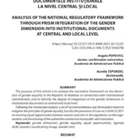 Prezentul articol are drept scop analiza cadrului normativ pe dimensiunea egalității de gen în Republica Moldova în conexiune cu angajamentele asumate la nivel internațional şi identificarea gradului de integrare a dimensiunii de gen în documentele instituționale la nivel central şi local. Urmare a analizei menționate au fost formulate un set de recomandări menite să integreze principiile egalității de gen, dar şi prevederile Legii nr.5 din 09.02.2021 cu privire la asigurarea egalității de şanse între femei şi bărbați în cuprinsul regulamentelor de organizare şi funcționare a autorităților administrației publice centrale şi locale.