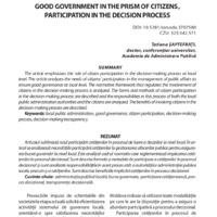 The article emphasizes the role of citizen participation in the decision-making process at local level. The article analyzes the needs of citizens’ participation in the management of public affairs to ensure good governance at local level. The normative framework that regulates the involvement of citizens in the decision-making process is analyzed. The forms and methods of citizen participation in the decision-making process are described and the responsibilities in this process of both the local public administration authorities and the citizens are analyzed. The benefits of involving citizens in the decision-making process are described.
