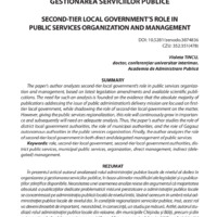 The paper’s author analyzes second-tier local government’s role in public services organization and management, based on latest legislation amendments and available scientific publications. The need for such an analysis is founded on the evidence that the absolute majority of publications addressing the issue of public administration’s delivery mission are focused on firsttier local government, while shadowing the role of second-tier local government on the matter. However, giving the public services regionalization, this role will continuously grow in importance and subsequently will need an adequate analysis. Thus, the paper’s author studies the role of district local government authorities, the role of municipal authorities, and the role of Gagauz autonomous authorities in the public services organization. Finally, the author analyzes the role of second-tier local government in both direct and delegated management of public services.