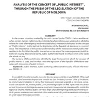 In the current situation, marked by the crisis caused by the COVID-19 virus worldwide, when certain human rights have been limited and sometimes even violated, in all states where the state of emergency has been established, a research dedicated to the concept of "Public interest", in the light of the legislation of the Republic of Moldova, is a current issue. The importance of the correct understanding of the notion/concept of public interest lies in the fact that the public interest serves as one of the main arguments/justifications for issuing decisions by some public authorities meant to influence in some cases the whole society. The purpose of this article is to identify the legal framework in which the concept of public interest is used, and in what sense the legislator of the Republic of Moldova operates with the notion of public interest.
