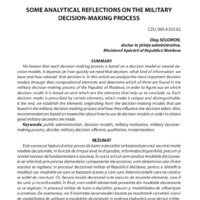 Este cunoscut faptul că orice proces de luare a deciziilor se bazează pe unul sau mai multe modele decizionale, în funcţie de timpul avut la dispoziţie, informaţia disponibilă, precum şi nivelul necesar de fundamentare a acesteia. În acest articol vom analiza modelele decizionale de referinţă prin prisma elementelor componente ale acestora, vom determina care dintre acestea se regăsesc în procesul decizional militar al Republicii Moldova, pentru a identifica modelul sau modelele pe care se bazează acesta şi care sunt determinantele care ne conduc la astfel de concluzii. Or, fiecare model decizional este prescris de anumite elemente, care îl fac unic şi inconfundabil. În final, vom stabili elementele provenite din modelele decizionale ce se regăsesc în procesul militar de luare a deciziilor, precum şi modalitatea de influenţare a acestora. De asemenea, vor fi înaintate recomandări bazate pe rezultatele cercetării vizavi de modalitatea de utilizare a modelelor decizionale în vederea elaborării unor decizii militare calitative.