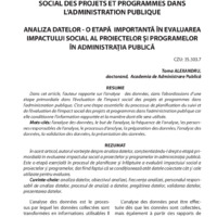 În acest articol, autorul vorbește despre analiza datelor, conștientizându-l drept o etapă primordială în evaluarea impactului social a proiectelor și programelor în administrația publică. Este o etapă esențială în procesul de planificare și înfăptuire a evaluării impactului social a proiectelor și programelor, dat fiind faptul că se condiționează atât datele colectate cât și cele utilizate pentru evaluare.