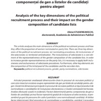Articolul prezentat analizează dimensiunile-cheie în procesul de recrutare politică și care este impactul acestora asupra reprezentării de gen pe listele de candidați pentru alegeri. Există trei dimensiuni principale în procesul de recrutare politică: a) tipul procedurii de nominalizare a candidaților; b) incluziunea electoratului; c) nivelul centralizării teritoriale. Analiza efectuată scoate în evidență 2 factori determinanți pentru componența de gen a listelor de candidați: primul factor reprezintă gradul de incluziune al selectoratului, el prezentând grupul de persoane din cadrul partidului care nominalizează candidați. Al doilea factor determinant fiind procedura de nominalizare a candidaților, existând 2 proceduri de bază: a) nominalizarea candidaților de către membrii de partid, organele executive ale partidului sau liderii de partid și b) aplicarea de sine stătător pentru listele de candidați.